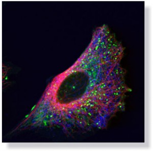Dividing cells. Microtubles (red, Cy3), EP (Green FITC), Heat shock proteins (Blue, Cy5).