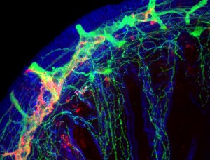 Mouse duodenum nerve fibers labeled with rabbit anti-PGP9.5 + donkey anti-rabbit Cy2 (711-225-152, green), enteric glial cells labeled with chicken anti-GFAP + donkey anti-chicken Cy3 (703-165-155, red) and muscle and vascular basement membranes labeled with goat anti-collagen IV + donkey anti-goat Cy5 (705-175-147, blue)