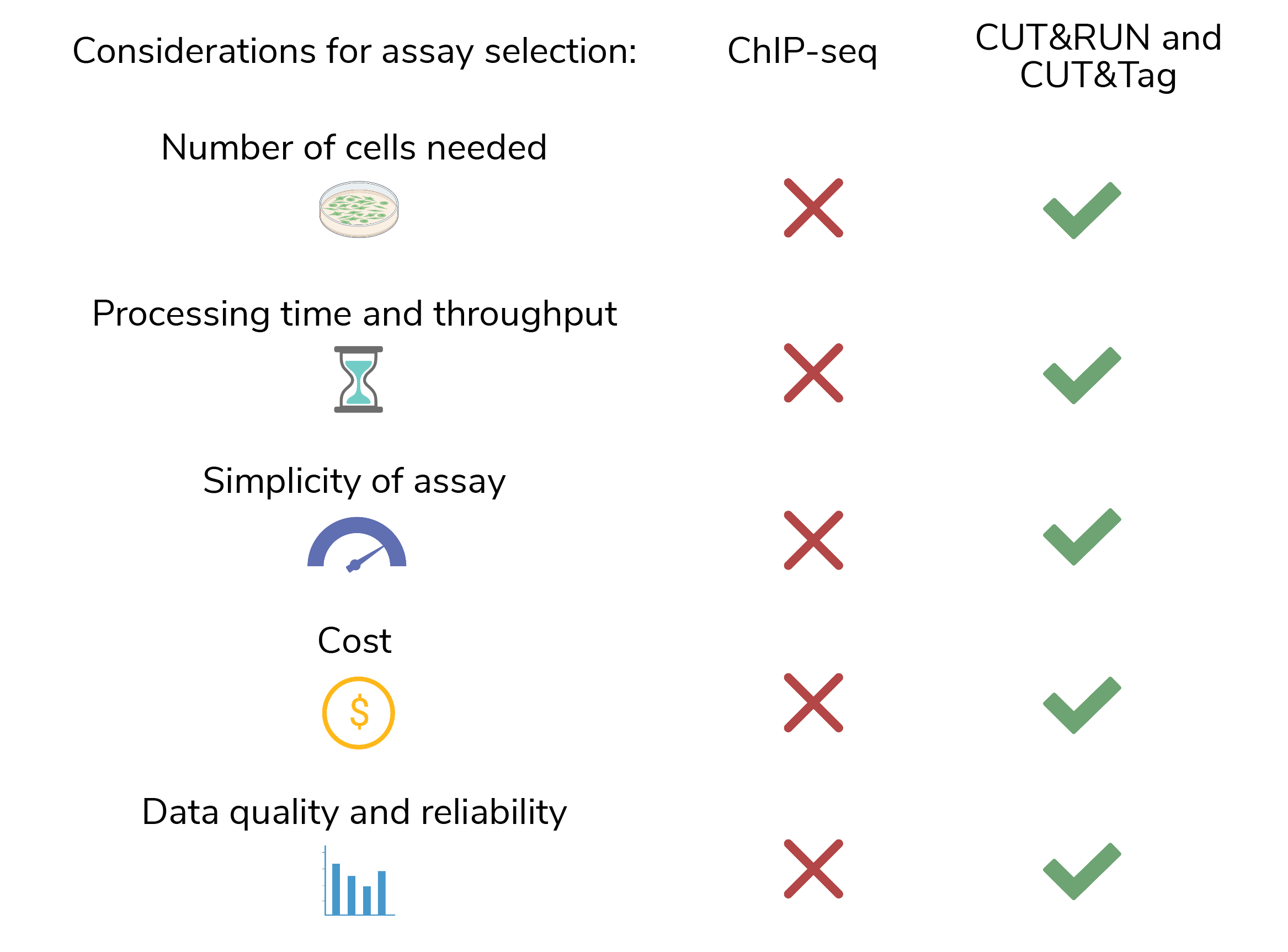 Below we outline the advantages of CUT&RUN vs. ChIP-seq, step-by-step. We also include comparisons with CUT&Tag where appropriate.
