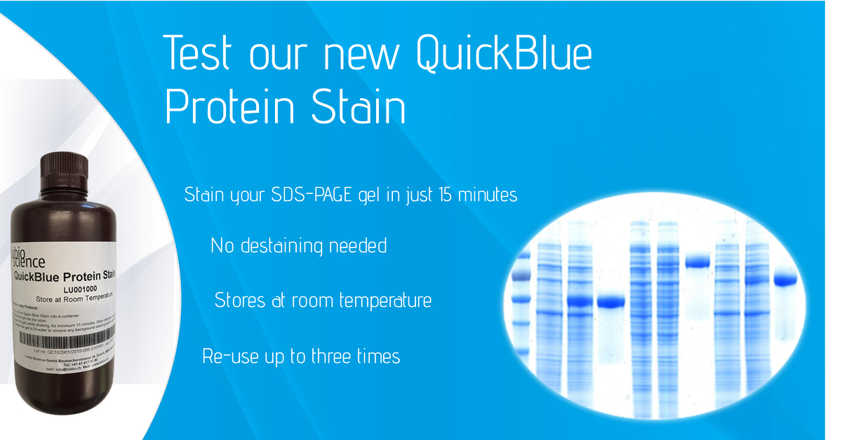 | LU001000 | QuickBlue Protein Stain, 1 Liter (40 gels) | 1 L |