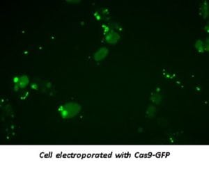 Compared to transfection with Cas9-expressing plasmid, delivery of purified Cas9 protein directly into cells by electroporation is relatively straightforward and may reduce the risk of issues associated with plasmid-based transfection, such as random integration of plasmid into the host genome. The presence of a nuclear localization signal (NLS) localizes the Cas9 RNP complex to the nucleus immediately upon entering the cell with the need for transcription or translation compared with mRNA or plasmid systems. Additionally, the Cas9 RNP complex is rapidly cleared from the cells minimizing the chance of off-target cleavage when compared to other systems. There is no need for transcription or translation processes.