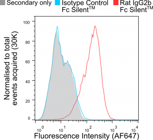 Mouse IgG2a and rat IgG2b isotypes are known to bind strongly to Fc receptors irrespective of the test antibody specificity. Isotype controls are employed to allow the researcher to distinguish between specific and non-specific background signals. In Figure 1, we show how murine macrophages are labelled almost as strongly by a rat IgG2b isotype control as by an anti-F4/80. Switching to Fc Silent™ antibodies results in reliable data with background staining indistinguishable from a secondary-antibody-only control. This also shows that Fc Silent™ antibodies are compatible with standard secondary antibodies.