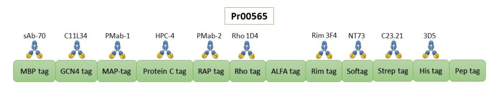 Figure 2: A schematic representation of the Absolute Antibody’s Multi-Tag control protein 2 (Pr00565), composed of 12 commonly used epitope tags shown in sequence from N- to C-terminal.