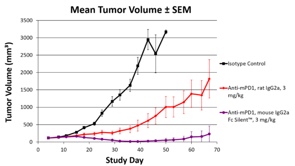 Our Fc Silent™ antibodies therefore enable researchers to remove effector function in vivo and reduce non-specific background in staining methods. In vivo, the antibodies benefit from the long plasma half-life (t1/2) associated with the Fc domain, with none of the cytolytic immune effector mechanisms associated with the wild-type Fc domain. In vitro, the antibodies can be used for flow cytometry and immunohistochemistry (IHC) applications to reduce non-specific background signal resulting from Fc receptor binding. The Fc Silent™ mutations do not affect other properties of the antibody, including their compatibility with secondary antibodies.