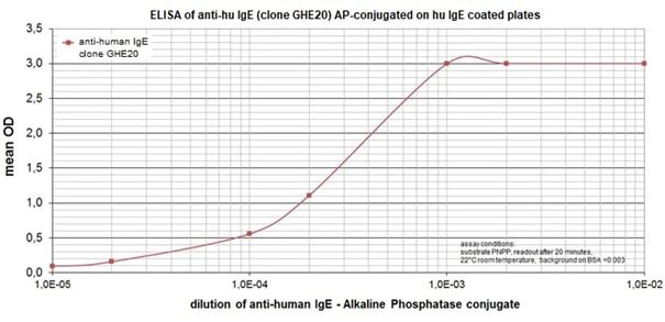 Clone GHE20 is already established in various immunoassays of our industry partners for the serolgoic detection of human IgE. From now on, our anti-human IgE (ε) antibody is also available for your serolgic analyses in allergy research or as a component for immunoassays.