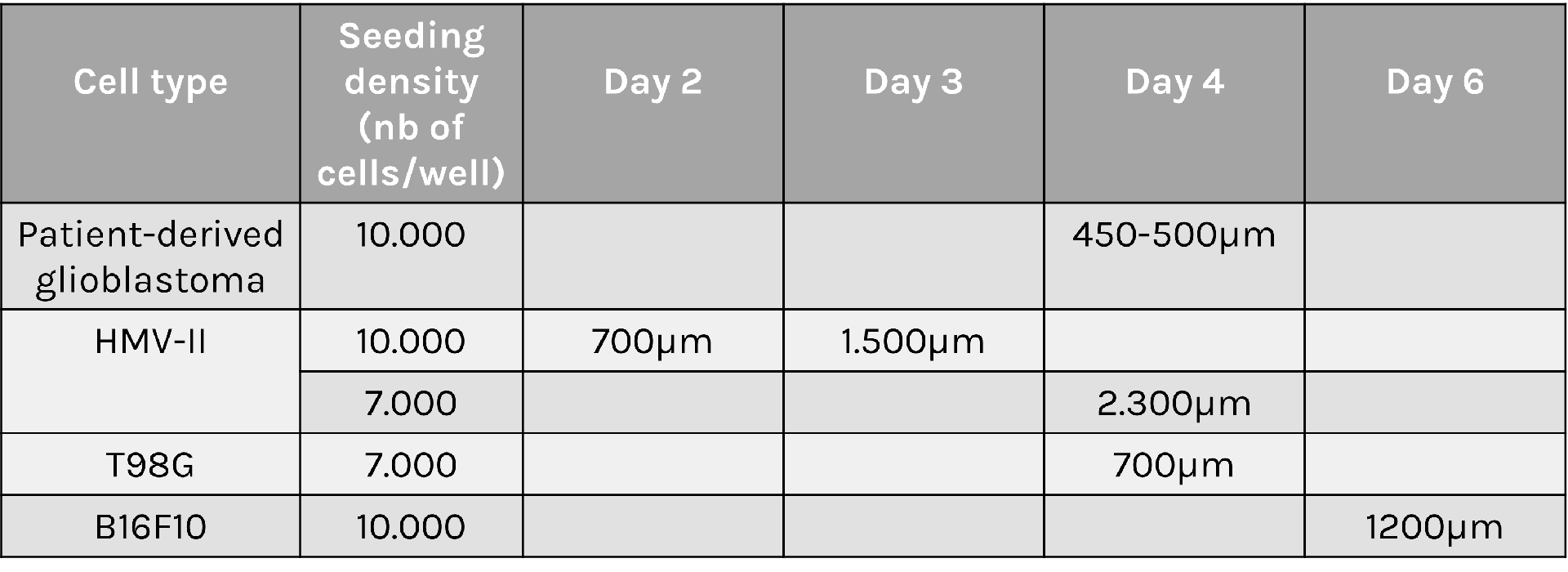Spheroid sizes can vary greatly depending on cell type characteristics, initial density and culture conditions used. To help you select optimal conditions, here are a couple of examples of sizes reached for different cell types and seeding densities:
