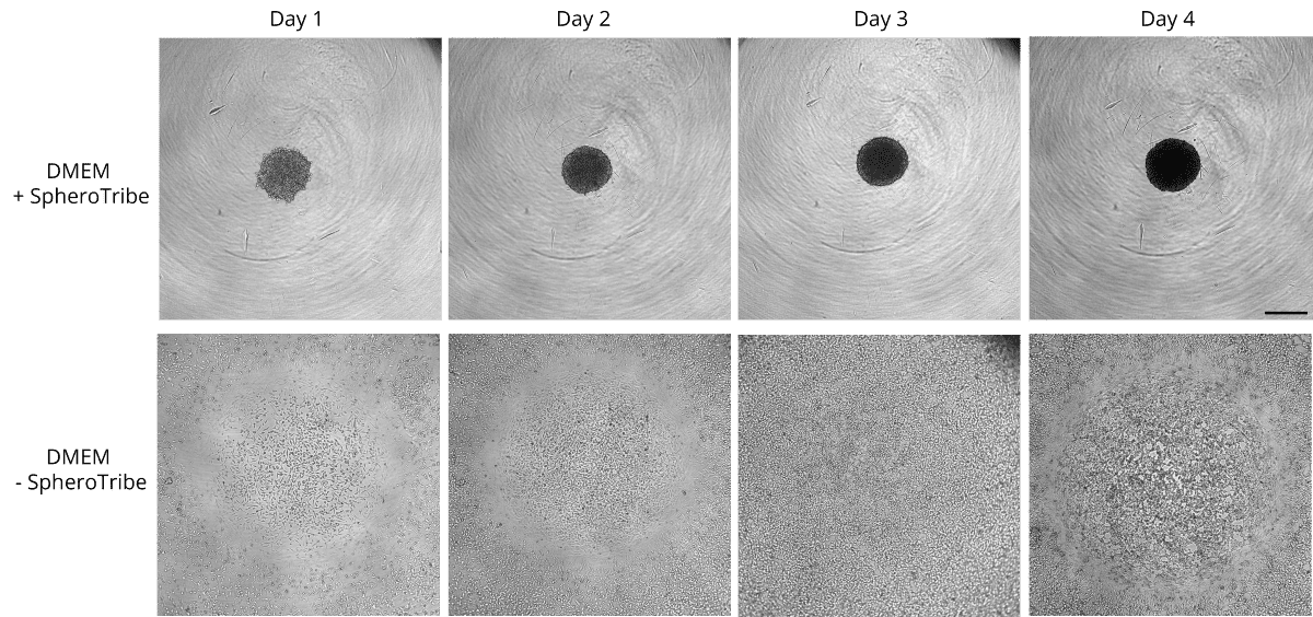 or absence (bottom) of the SpheroTribe concentrate. Scale bar = 500 µm