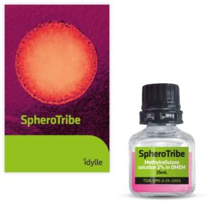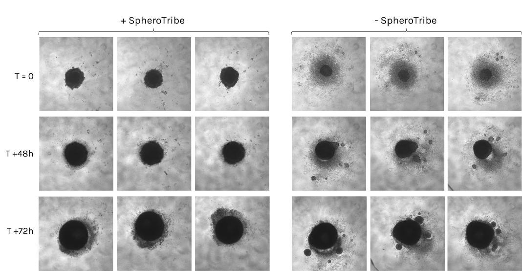 SpheroTribe provides a gel-like scaffold that favors cell-cell contacts by increasing medium viscosity. It was shown to generate compact spheroids mimicking solid tumors, improve spheroid formation with some of the most challenging cells and to speed up stem cell-derived organoid formation.