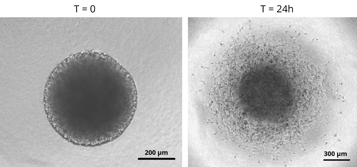 SpheroTribe is particularly useful to boost aggregation when working with challenging cells, minimize variability between samples and improve the consistency of your migration/invasion assays, immunostaining, drug screening or in vivo implantation experiments.