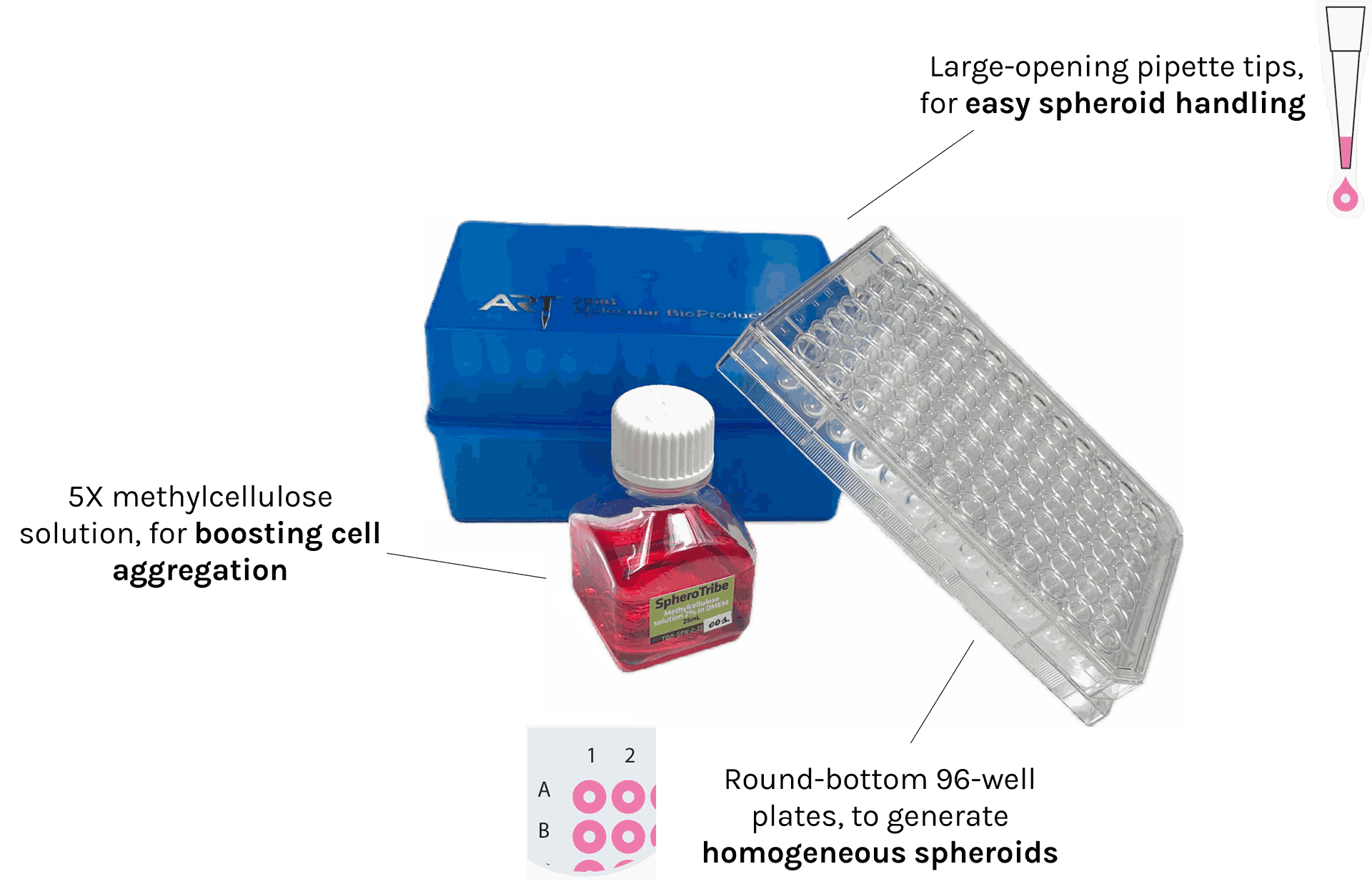 In addition to the SpheroTribe solution, the full kit also includes U-bottom plates and wide-opening tips so you have everything you need to get started with your 3D cell culture experiments.