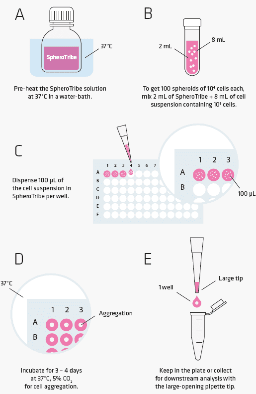 SpheroTribe relies on the use of methylcellulose, a crowding agent that is well-known to drive efficient cell aggregation into spheroids. Once diluted in culture medium, methylcellulose increases the viscosity of the medium, creating a gel-like environment that restrict cell movement and encourages cell-cell contacts for the formation of compact spheroids.