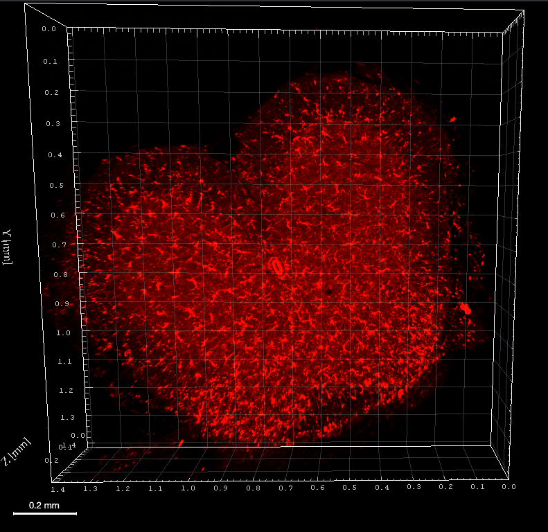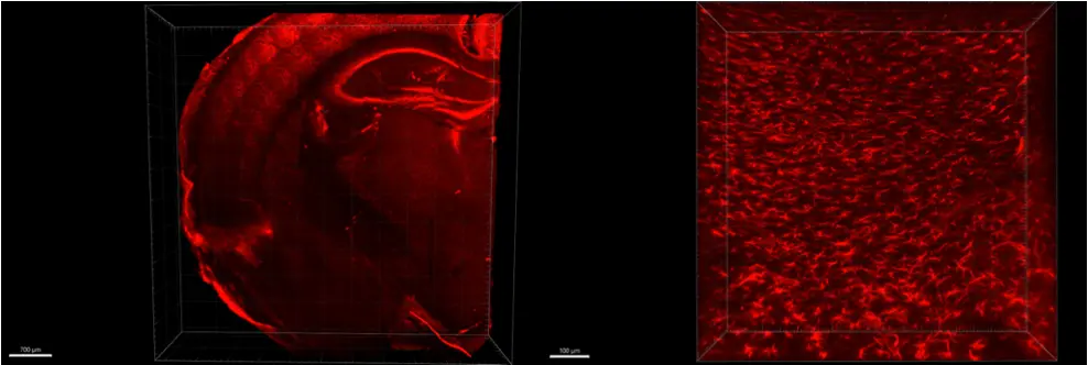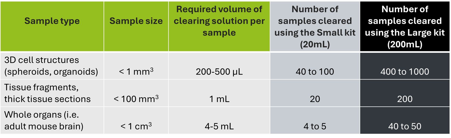 Sample shrinkage has been observed within the first few minutes of incubation in the clearing solution, which is explained by the difference in osmolarity between the sample and the solution leading to dehydration. This effect is then attenuated after a few minutes as the clearing solution penetrates inside the structures.