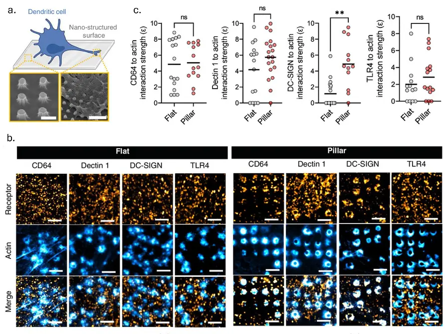 Immature hDCs were cultured on Fakirslides (round pillars). a. Scanning electron microscopy images showing a detail of the surface topography (left) and the deformation of the plasma membrane of hDCs to adapt the shape of the surface topography (right). Scale bar: 1.5 and 3 μm, respectively. Schematics generated by BioRender. b. Representative Airyscan images showing the endogenous organization of the receptors (orange hot LUT) CD64, Dectin 1, DC-SIGN, and TLR4 relative to podosomes (cyan hot LUT) at the plasma membrane of immature hDCs on flat or vertical pillar topographies. Scale bar, 2 μm. c. Interaction strength (ε) of CD64, Dectin 1, DC-SIGN, or TLR4 with the actin signal at the plasma membrane of immature hDCs seeded on flat (gray) or vertical pillar topographies (red). Solid line represents the mean. Cells analyzed (n) from 2 biological replicates, n = 16, n = 15, n = 17, n = 13 for flat and n = 13, n = 19, n = 12, n = 15 for pillar topographies, respectively. Mann–Whitney test: n.s. P > 0.05, **P < 0.01.
