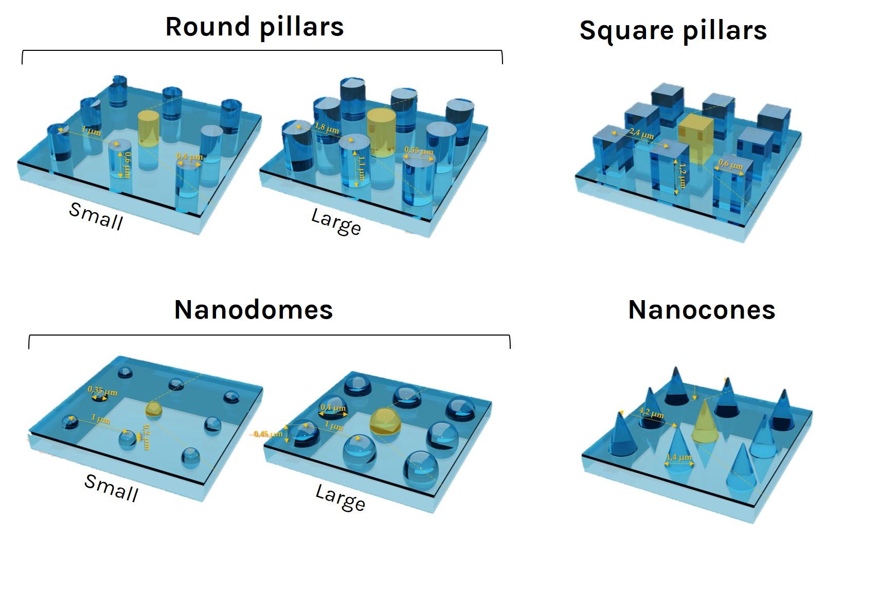 Surface topographies: round or square pillars, nanodomes or nanocones