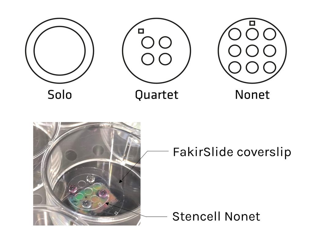 Stencells are silicon chambers that you can easily stick and remove from the FakirSlide coverslips to create controlled culture areas. They will help you make the most of your FakirSlide coverslips.
