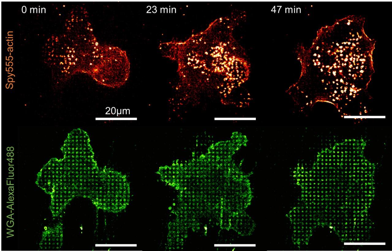 Snapshots of cytoskeleton (spy555-actin, orange) and plasma membrane dynamics (WGA-AlexaFluor488, green) of moDC seeded on round pillars (Large). Images were acquired on a spinning disk microscope (Nikon Ti Inscoper CSU-X1, objective 100X Plan Apo lambda 1.45 NA DT 0.13mm oil).