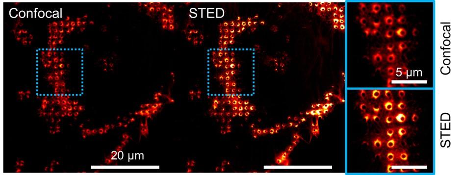 Confocal and STED images showing the organization of the actin cytoskeleton (STAR 580 phalloidin, Abberior) of moDC cells seeded on round pillars (Large). Images were acquired on an Abberior STED super-resolution microscope (Objective 100X Plan SuperApochromat N.A 1.4 Oil).
