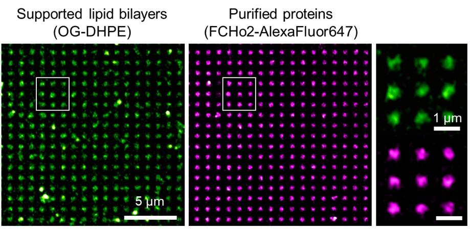 Airyscan sub-diffraction microscopy images of a nano-domes surface (Small) functionalized with supported-lipid bilayers (doped with 0.2% of OG-DHPE, green) along with the organization of the recombinant protein FCHo2 labeled with AlexaFluor647 (protein concentration was 1 µM, magenta). Images were acquired on a confocal/airyscan Zeiss LSM880 microscope (objective 63X Plan Apo Oil 1.4NA).