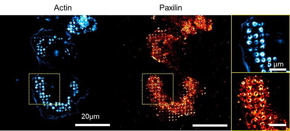 Airyscan sub-diffraction microscopy images of moDC cells seeded on round pillars (Large) and immunostained to visualize the endogenous organization of paxillin (anti-paxillin rabbit polyclonal antibody GTX125891, orange) and the actin cytoskeleton (phalloidin Atto647N, blue). Images were acquired on a confocal/airyscan Zeiss LSM880 microscope (objective 63X Plan Apo Oil 1.4NA).