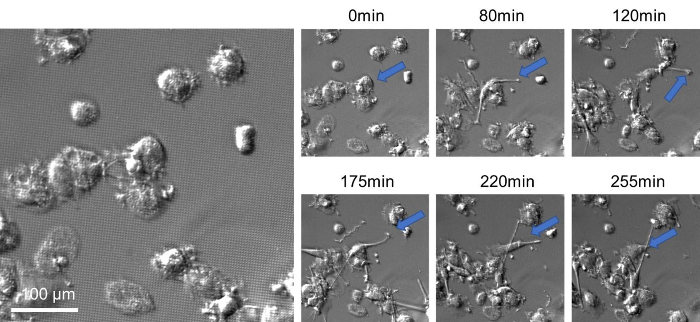 Snapshots of the dynamics of moDCs cells seeded on round pillars (Large). Images were acquired on an inversed Olympus IX83 video-microscope (transmitted light, objective 40 X objective 40x LUCPLFLN 0,6NA RC2) 0.6 NA. Blue arrows point to membrane projections propelled during the migration of moDC cells.