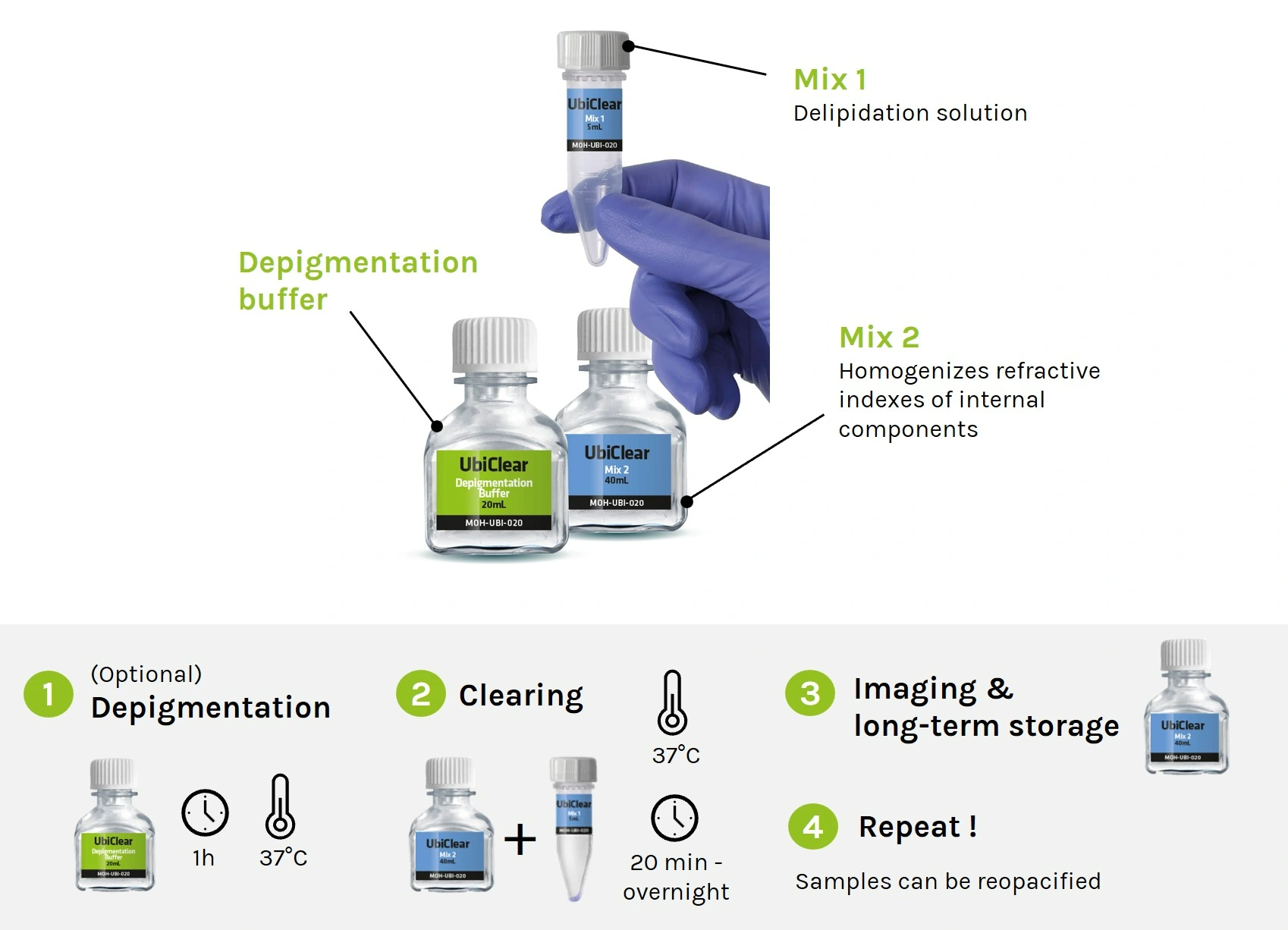 The UbiClear kits include a Depigmentation Mix, a Clearing Base and some Imaging Solution. Everything you need to have on your end is some water, 0.2M Tris at pH 8 and some 30% hydrogen peroxyde.