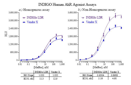 INDIGO’s assays are not binding assays. They are cell-based trans-activation assays, and the principal application is in the screening of test samples to quantify any functional activity, either agonist or antagonist, that the compounds may exert against the nuclear receptors. INDIGO reporter systems utilize firefly luciferase reporter gene technology, and while there is a binding taking place, our assays do not measure it. Instead, the luciferase light response is measured which correlates to the activation status of the receptor (either activation or inhibition).