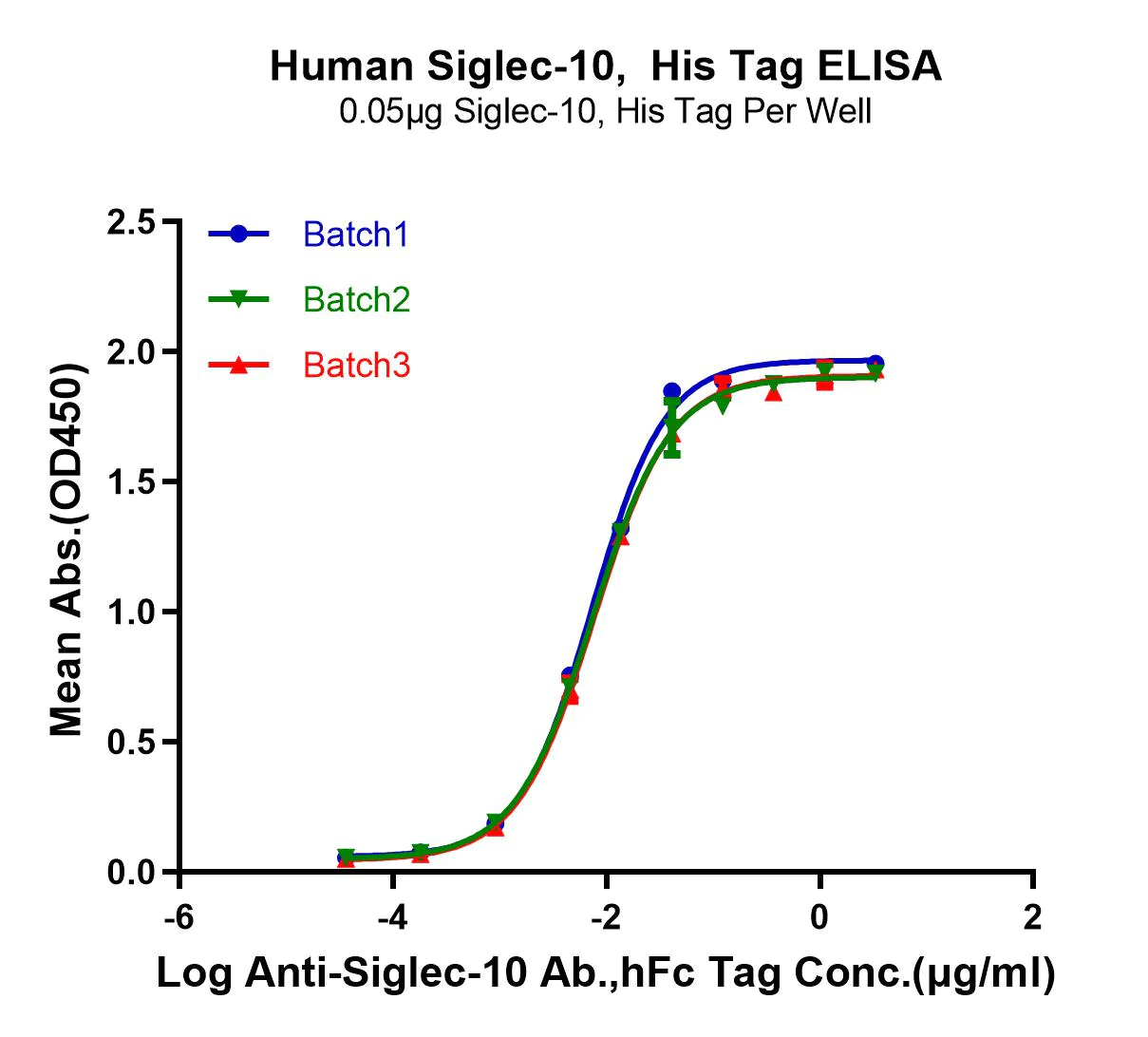 Fig 2. Immobilized Human Siglec-10, His Tag at 0.5µg/mL (100µl/well) Dose response curve for Anti-Siglec-10 Ab., hFc Tag with an EC50 OF 7.3, 7.7 and 7.4ng/mL, respectively asgetermined by ELISA