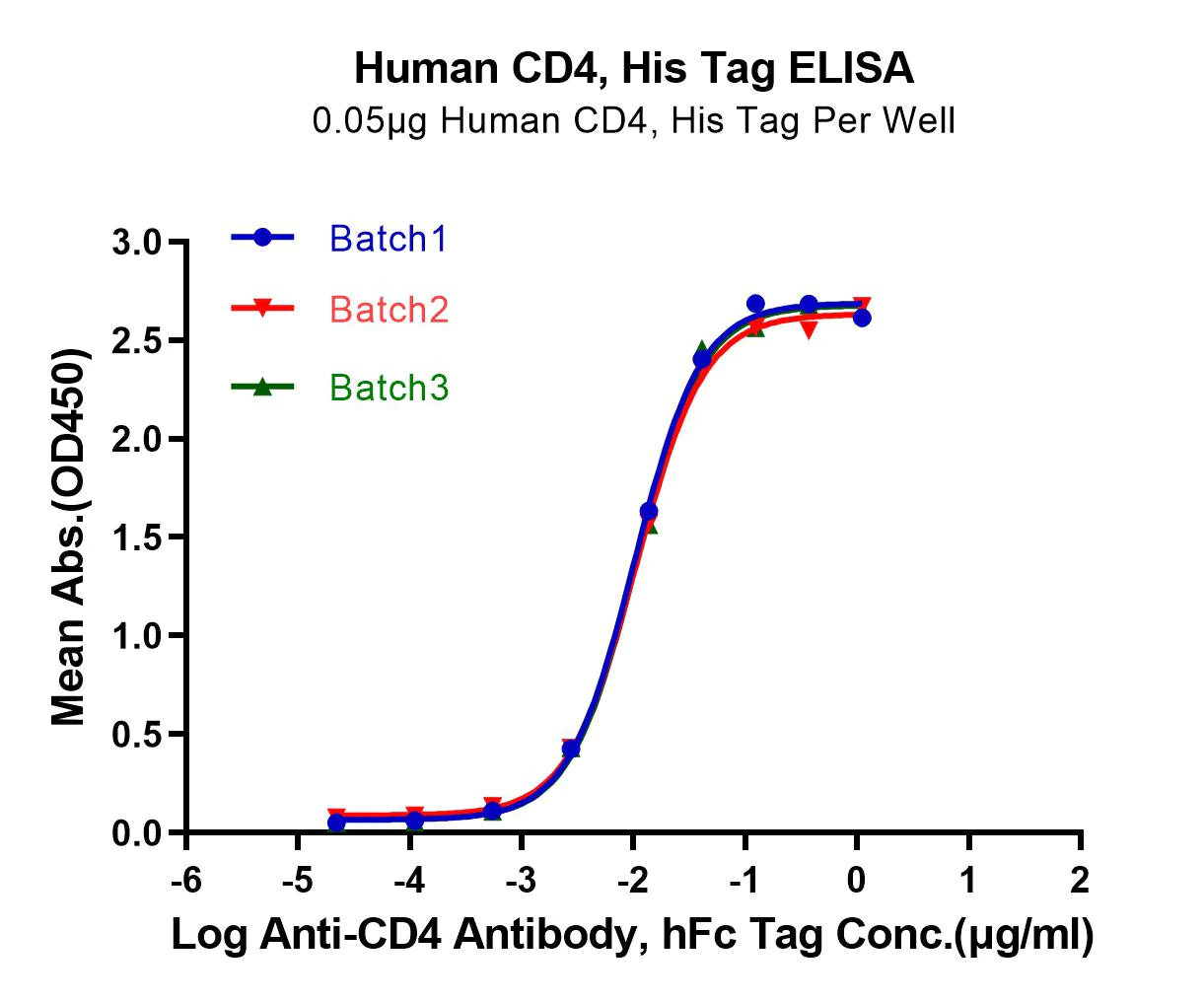 Fig 3. Immobilized Human CD4 at 0.5µg/mL (100µl/well) on the plate. Dose response curve for Anti-CD4 Antibody, hFc Tag with an EC50 OF 10.2, 10.6 and 10.6 ng/mL respectively as determined by ELISA
