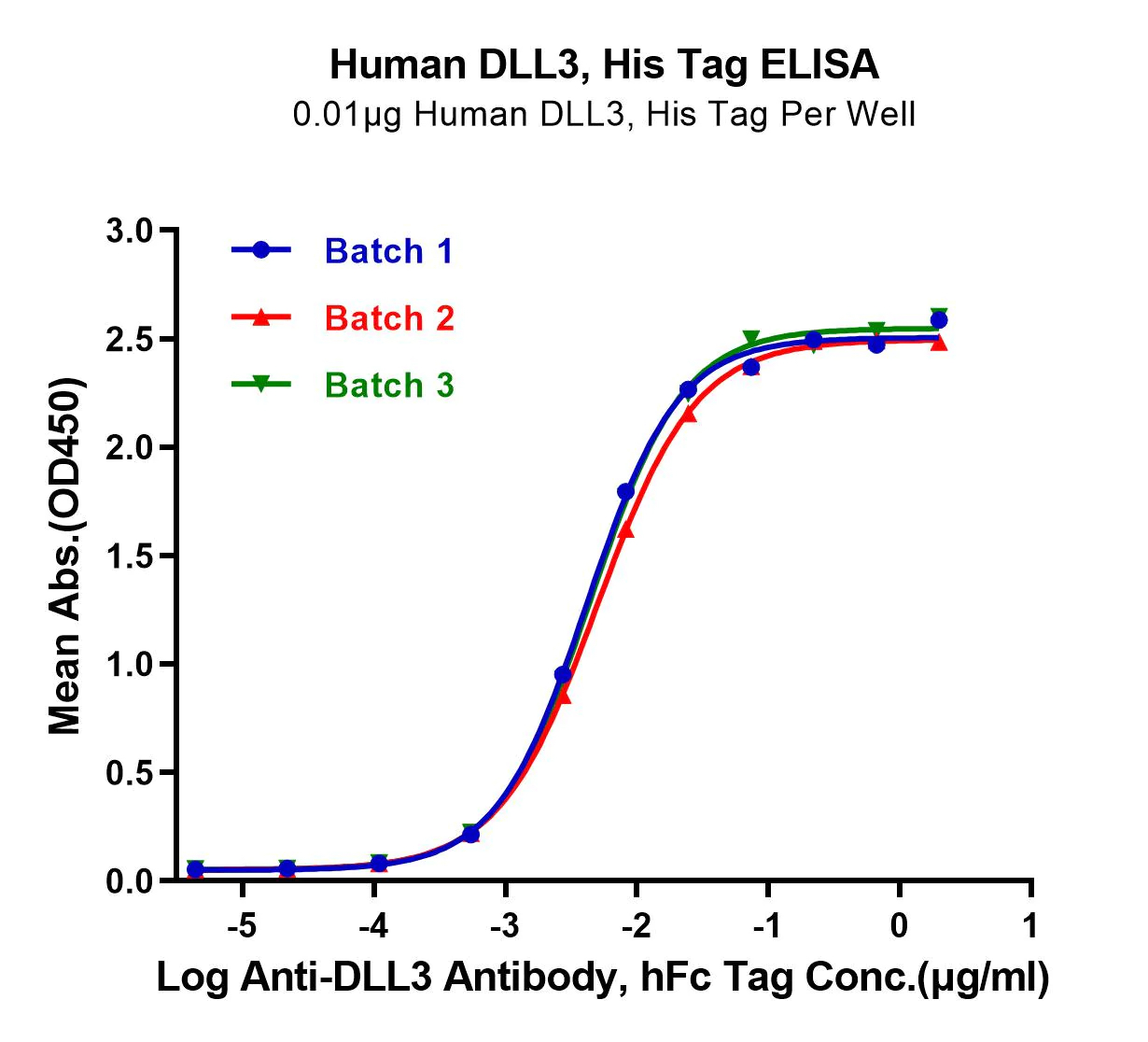 Fig 1. Imobilized Human DDL3, His Tag at 0.1µg/mL (100µl/well) on the plate. Dose response curve for Anti-DDL3 Antibody, hFc Tag with an EC50 of 5.0, 4.5 and 5.0 ng/mL respectively determined by ELISA