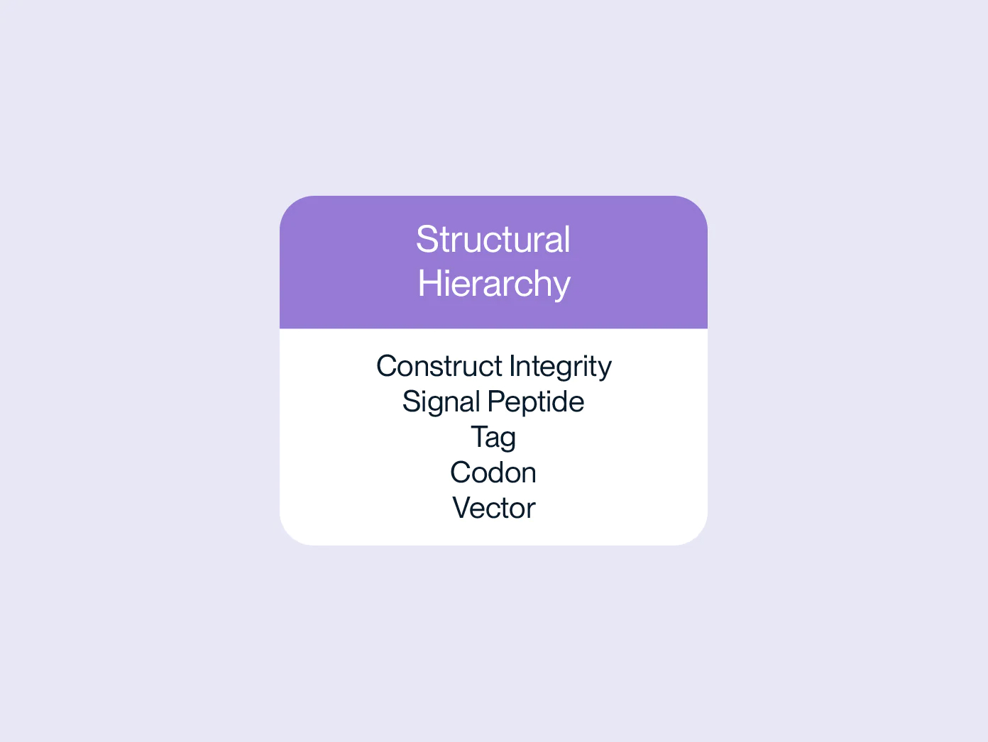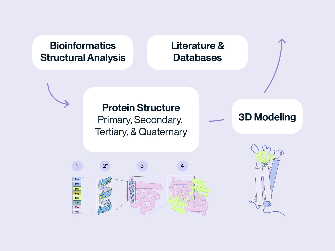 Integrity, signal peptide, codons, etc. are analyzed using structural informatics and 3D modeling to determine how they will influence all four levels of protein structure.