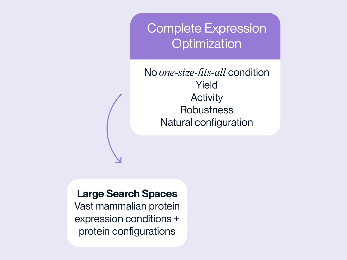 The optimal protein configuration is identified from large search spaces of protein configurations and expression conditions. We prioritize natural protein configuration, yield, and bioactivity.