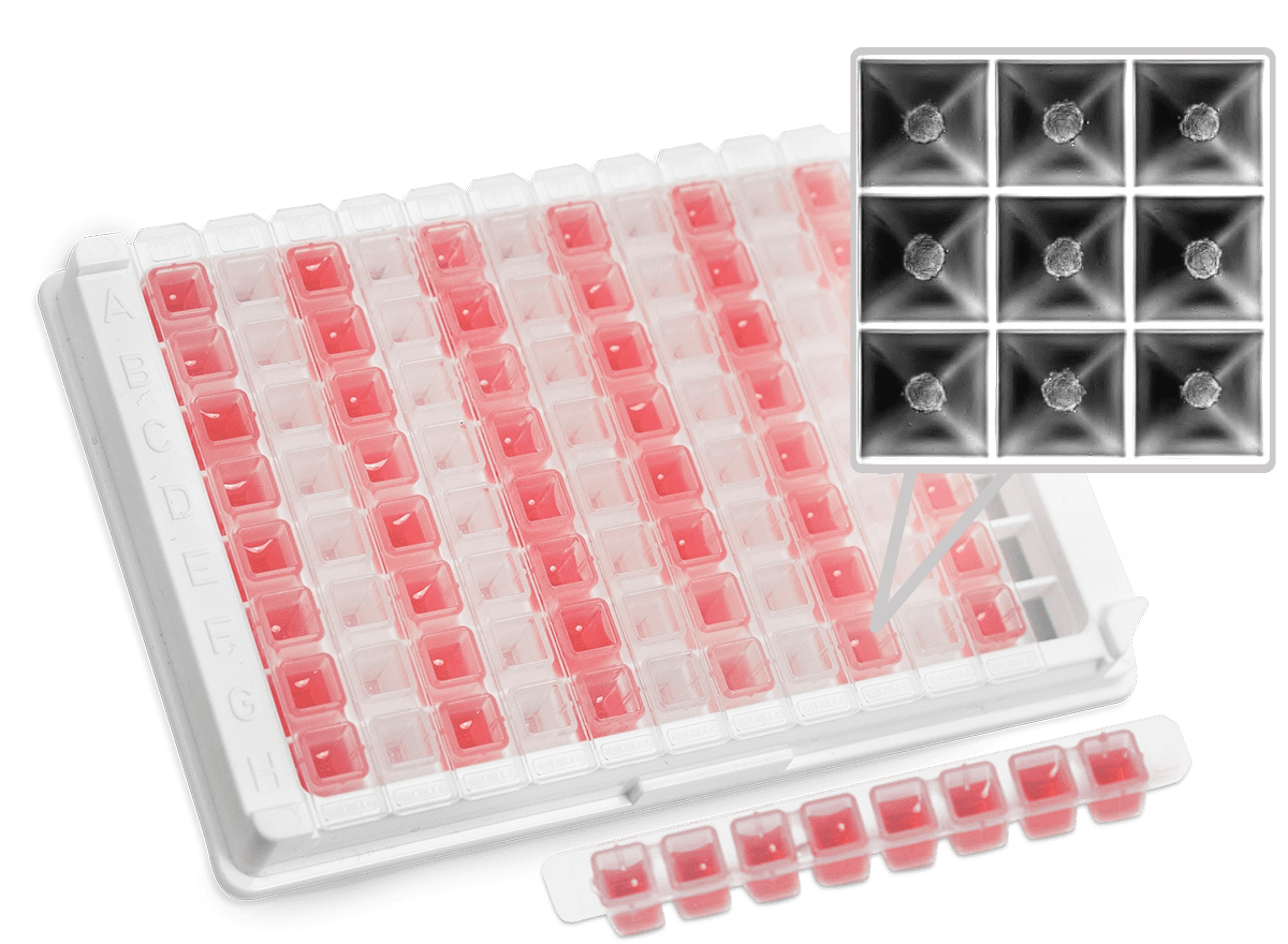 25 uniform, size-controlled spheroids with one move. 2’400 standardized spheroids per 96-well Strip Format.