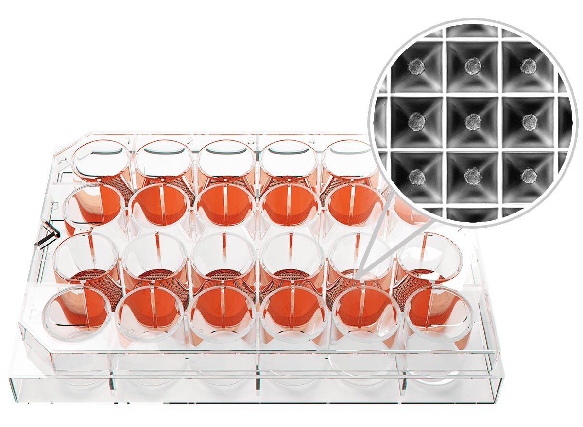 750 uniform, size-controlled spheroids with one move. 9000 standardized spheroids per 24-well plate.