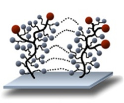 The characteristics of surfaces that have been functionalized using Molecular Surface Engineering are solely specified by the functional matrix. Thus, the mechanical characteristics of the source material are combined with the new biological-chemical characteristics of the surface. The surface can contain both simple functional groups such as –COOH or –NH2 and complex peptide or DNA molecules. The morphology of the functional matrix is alterable, and that is a core competence of PolyAn: Not only “brushes”, “tentacles” or dendritic structures are possible, but also diagonally integrated layers, so that the result is a loading density that can be narrowly fine-tuned to the specific application.