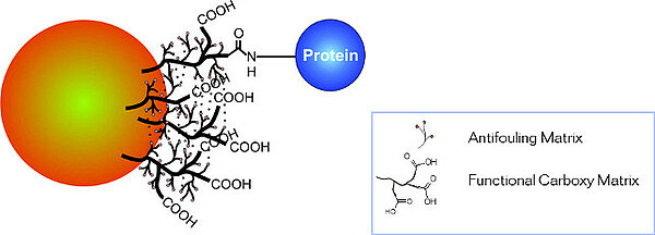 Please note, that the carboxy functionalities can be used for surface activation via 1-Ethyl-3-(3-dimethylaminopropyl) carbo-diimide (EDC), N-hydroxy succinimide (NHS).