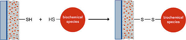 Aldehyde groups react immediately with the NH2-terminus of biochemical species to form a covalent bond with the surface (420 kJ/mol). In an intermediate state the Aldehydes form an instable Imine-group with the Amines (Schiff-base). It is also possible to reduce the Imines with Sodium Borhydride to form stable Amines.