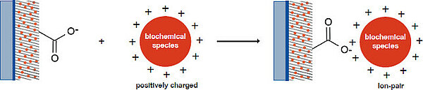 An adsorptive immobilization is a non-covalent coupling method on solid supports which is realized by electrostatic, Van der Waals interactions, hydrogen bonds and hydrophobic interactions of the reactants, respectively. An electrostatic interaction is formed by an ion-ion-interaction between the surface and the applied biochemical species. The dissociation energy for typical electrostatic bond is 130 kJ/mol. It is about a third of the strength of an average covalent bond. In order to achieve an optimal adhesion the probe buffer und the adhesion conditions (pH-value) have to be optimized.