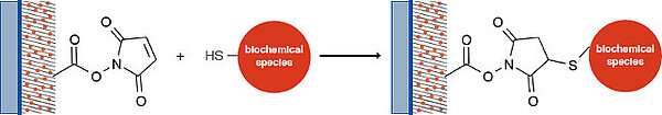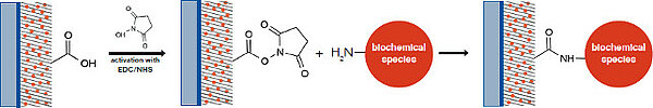 The NHS-ester reacts immediately with the NH2- terminus of biochemical species to form a covalent bond with the surface (420 kJ/mol). The reaction of carboxyl functionalities with N- Hydroxy succinimide leads to highly reactive esters, which can be easily reacted with nucleophiles e.g. amines, hydrazines. However, due to its high reactivity the NHS ester is susceptible against hydrolysis and is characterized by a relatively short shelf-life. All NHS-activated surfaces should therefore be processed quickly.