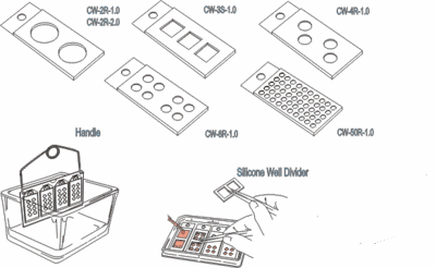 Staining and washing procedures may be performed with MultiSlip™ inserts in the plate, or silicone backed coverglass may be removed individually and affixed to glass microscope slides. Alternately, inserts may be easily removed for batch processing in glass staining dishes.
