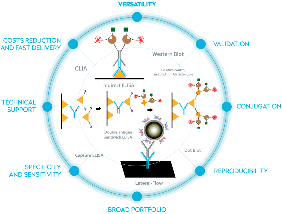 Rekom Biotech is a biotechnology company focused on the design and manufacturing of IVD reagents for in vitro diagnostics. We offer high quality, validated and versatile raw material, suitable for use in the various platforms available on the market, such as second and third generation ELISAs, immunochromatography, chemiluminescence, Western blot, dot-blot, etc.