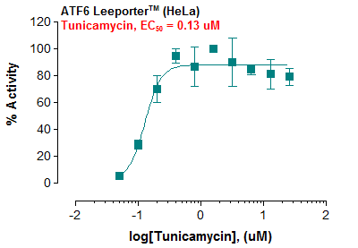 Description: The ATF6 Leeporter™ Luciferase Reporter cell line is a stably transfected HeLa cell line which expresses Renilla luciferase reporter gene under the transcriptional control of the activating transcription factor 6 (ATF6)-response element. ATF6 is a member of the basic-leucine zipper transcription factor family, which is located in the endoplasmic reticulum (ER) membranes and plays a central role in transcriptional activation of ER molecules. The ATF6 induction by Tunicamycin is shown in Figure 1.