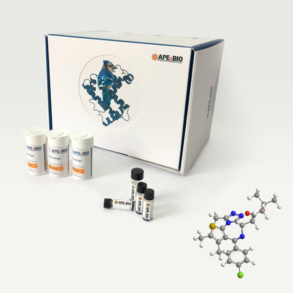 Description: Bromodomain Inhibitor, (+)-JQ1 is a potent and highly specific inhibitor for the BET (bromodomain and extra-terminal) family of bromodomains. (+)-JQ1 binds to BRD4 bromodomains 1 and 2 with Kd values of ~ 50 and 90 nM, respectively. The binding is competitive with acetyl lysine. (+)-JQ1 can be a useful chemical probe to investigate the role of BET bromodomains in the transcriptional regulation of oncogenesis.JQ1 exhibited strong dose-and time- dependent inhibition of BRDT and could significantly diminish the activity of a close structural relative of BRDT. A close look at JQ1 bound BRDT confirmed that the acetyl-lysine recognition site of BRDT was blocked. [1]JQ1 does not produce sedative or anxiolytic effects and is instead a potent and selective inhibitor of the bromodomain testis-specific protein BRDT [2], which is essential for chromatin remodeling during spermatogenesis. By blocking BRDT, JQ1 effectively blocks the production of sperm in the testes and consequently produces effective contraception, without the negative side effects associated with previously researched hormonal contraceptives for men.References: 1. Matzuk, Martin M., et al. 'Small-molecule inhibition of BRDT for male contraception.' Cell 150.4 (2012): 673-684. 2. Filippakopoulos, P.; Qi, J.; Picaud, S.; Shen, Y.; Smith, W. B.; Fedorov, O.; Morse, E. M.; Keates, T. et al. (2010). 'Selective inhibition of BET bromodomains'. Nature 468 (7327): 1067-1073.