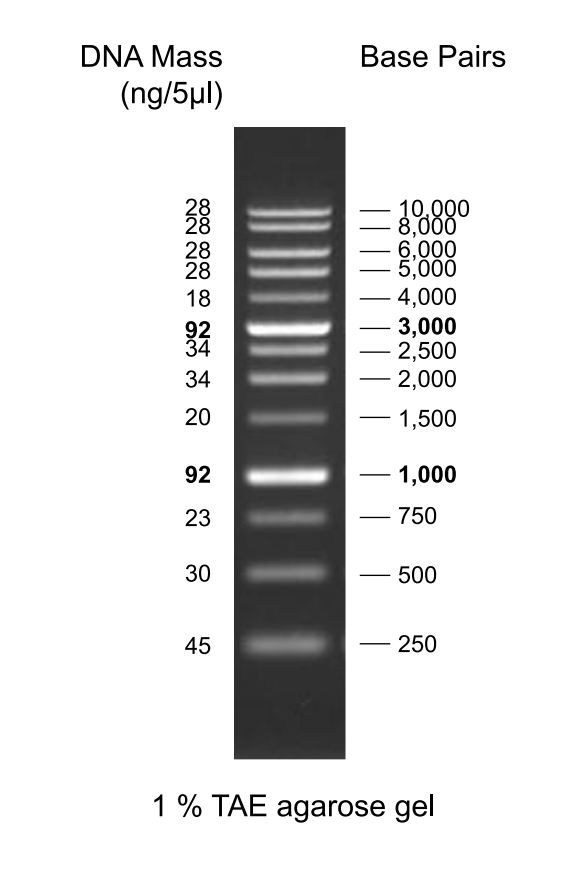 Description: ClearBand DNA Marker 1kb-Blue is a ready-to-load molecular weight marker suitable for DNA fragment size determination on gel electrophoresis. PCR products and double-stranded DNA were digested with appropriate restriction enzymes to completion to yield 14 bands, ranging from 250 bp - 25 kb, for molecular weight standards in agarose gel electrophoresis.