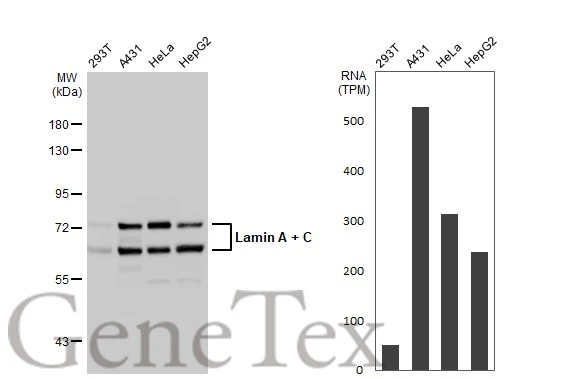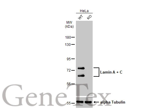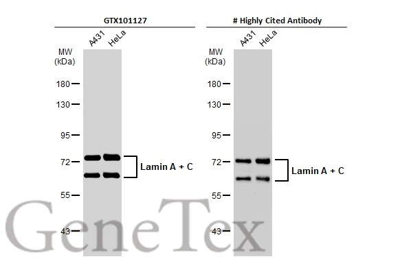 | Immunogen: | Recombinant protein encompassing a sequence within the center region of human Lamin A + C. The exact sequence is proprietary. |