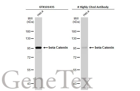 Beta-catenin antibody recognizes beta-catenin protein, which acts as a cell adhesion factor as well as an effector of Wnt signaling pathway-driven transcription. Mutation or dysregulation of beta-catenin is associated with many diseases, including developmental disorders and cancers. There are a plethora of commercially available beta-catenin antibodies, among which GeneTex's beta-catenin antibody (GTX101435) is one of the most rigorously validated and widely cited for a number of applications.