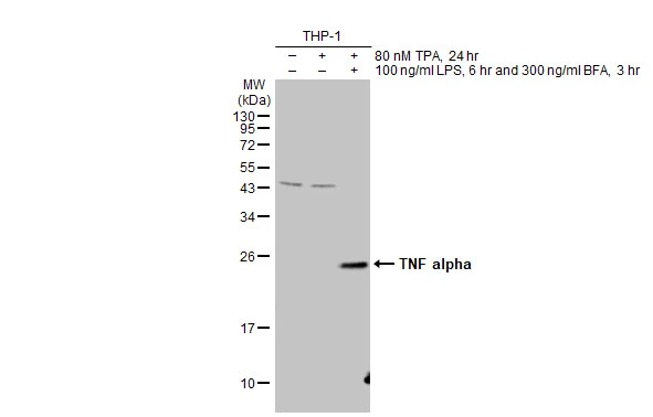 TNF alpha antibody recognizes tumor necrosis factor alpha protein, a cytokine with a predicted molecular weight of 26 kDa. TNF alpha is mainly secreted by macrophages, but is also produced by various immune cells such as neutrophils, T helper cells, and NK cells. Dysregulation of TNF alpha expression is associated with various diseases including cancers and autoimmune disorders.