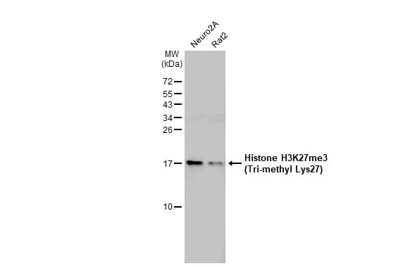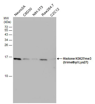 | Immunogen: | Carrier-protein conjugated synthetic peptide surrounding tri-methyl Lys27 of human Histone H3. The exact sequence is proprietary. |