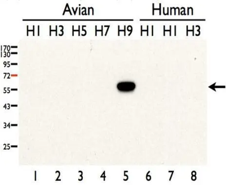 | Immunogen: | Recombinant protein encompassing a sequence within the N-terminus region of Influenza A virus H9N2 HA (Hemagglutinin) (A/turkey/Wisconsin/1/1966(H9N2). The exact sequence is proprietary. |