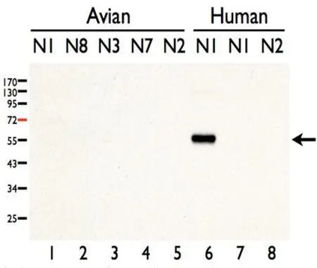 | Immunogen: | Recombinant protein encompassing a sequence within the C-terminus region of Influenza A virus H5N1 NA (Neuraminidase) (A/Viet Nam/1203/2004(H5N1). The exact sequence is proprietary. |