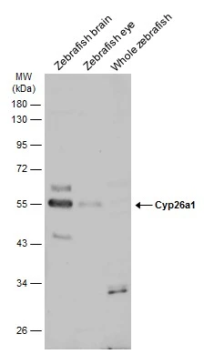 | Immunogen: | Recombinant protein encompassing a sequence within the center region of zebrafish Cyp26a1. The exact sequence is proprietary. |